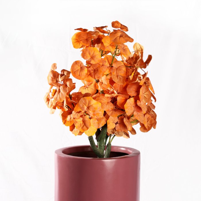 This Artificial Peperomia Watermelon features a compact, decorative form with soft, rounded leaves arranged in a dense, natural cluster. The warm orange-toned foliage creates a striking visual contrast, making it an eye-catching accent piece for modern interiors.