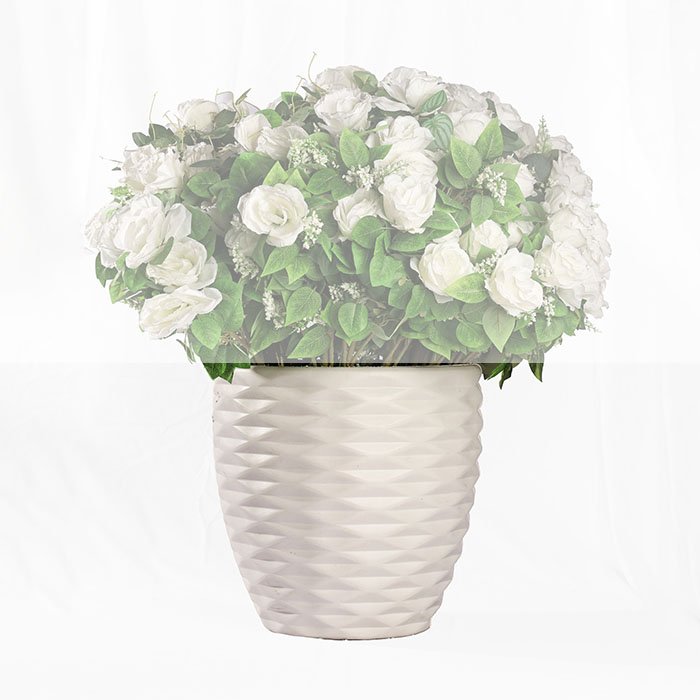 The floral arrangement appears full and neatly layered, showcasing white rose-style blooms with fresh green foliage. The flowers form a rounded crown that sits gracefully above the pot, creating a balanced contrast between the soft florals and the structured, textured base.