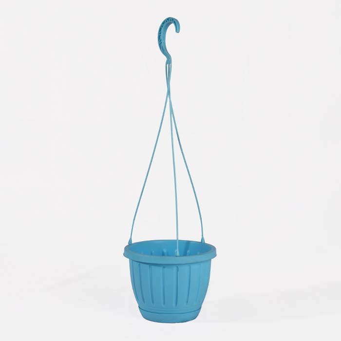 This Plastic Hanging Pot features a fresh blue finish with a classic round shape and subtle vertical ribbing that adds texture without overwhelming the design. The slim hanging wires and curved hook ensure a secure, well-balanced suspension.