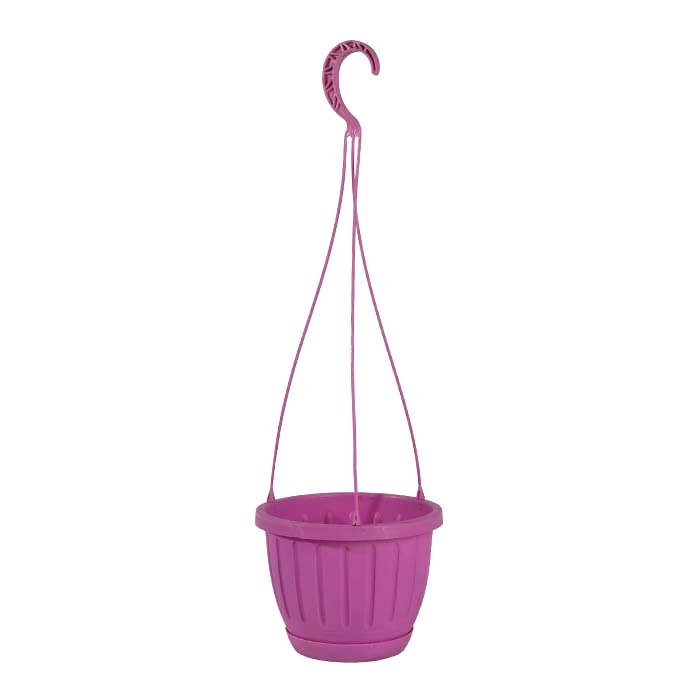 This Plastic Hanging Pot features a soft pink color with a classic round shape and vertical ribbed detailing that adds a clean, decorative touch. The slim hanging wires and curved hook provide a balanced and secure way to display plants elegantly.
